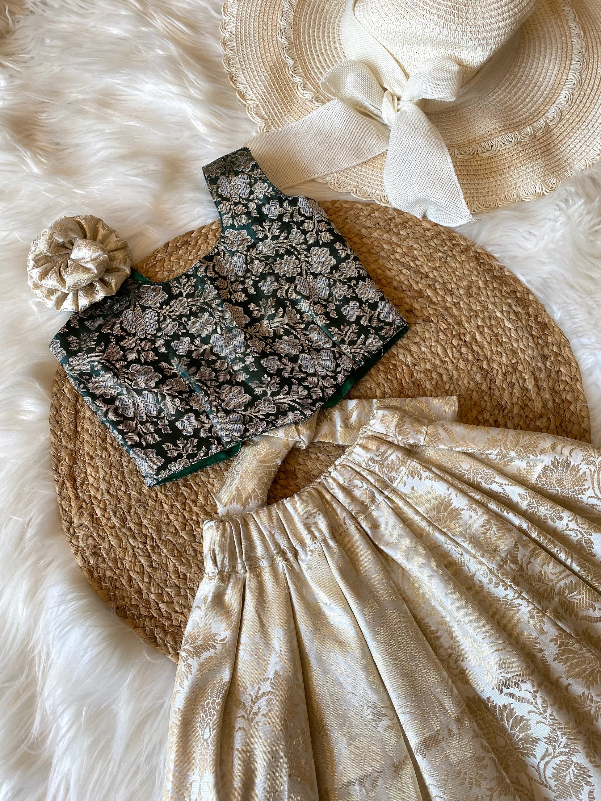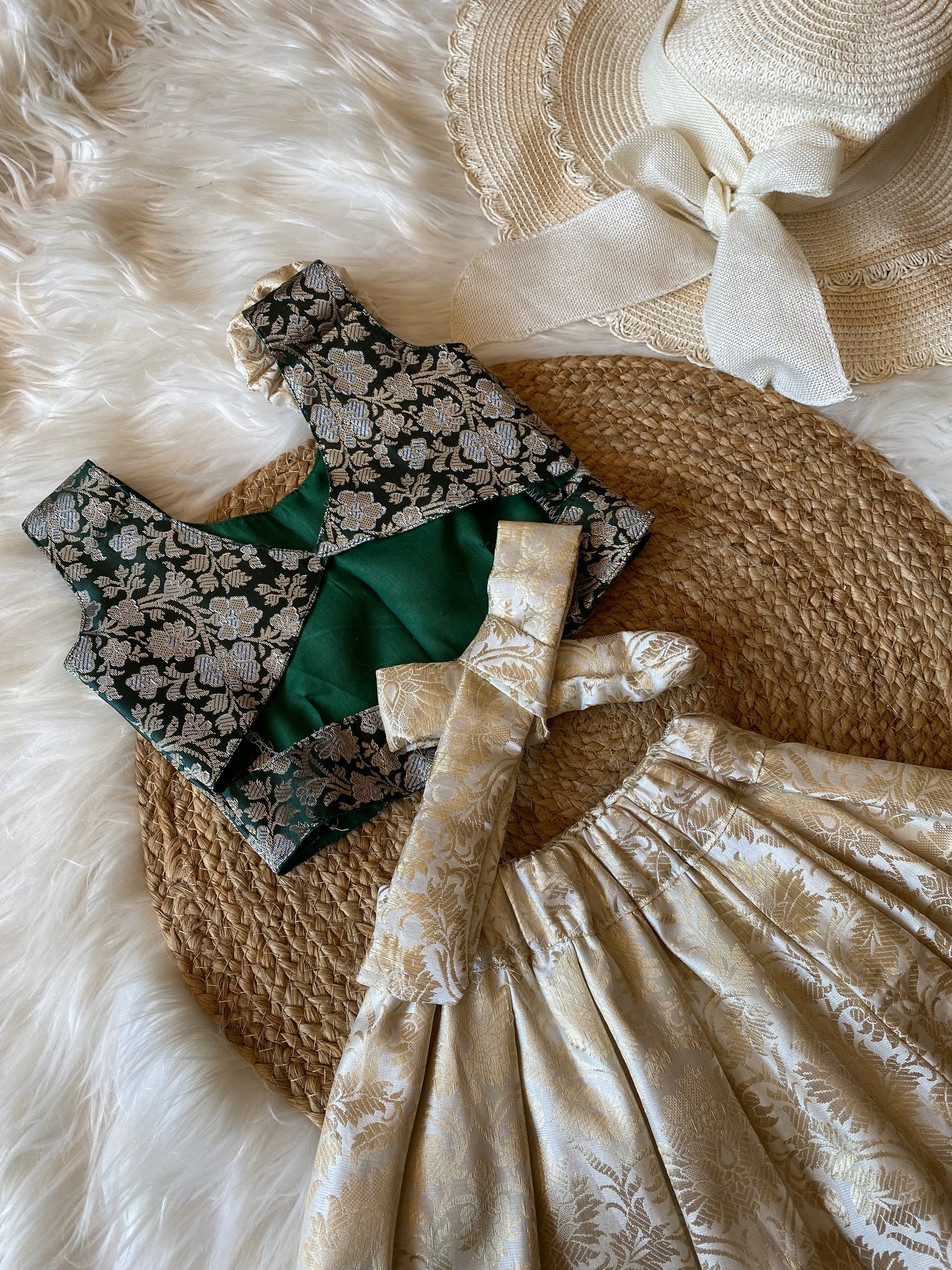 - Banarasi Green Floral Top with Designer Back Which has Hook & Knot for Bow & Soft Pleated Elastic Skirt with Green Brocade Border