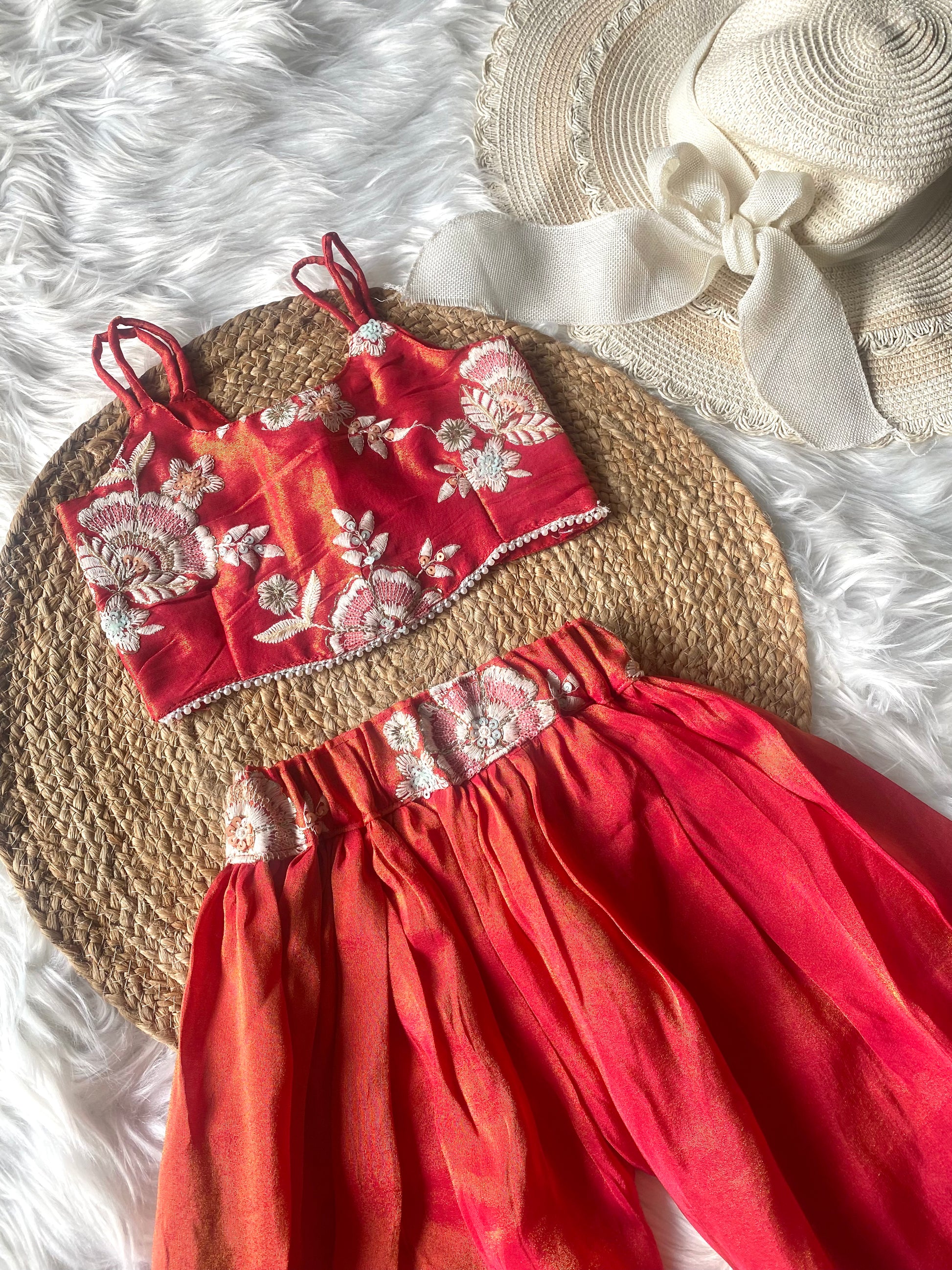 - Zari Tissue Sequence Embroidery Pearl Detailing Double Sleeves Top with Rust Orange Plain Zari Tissue Parallel Pants