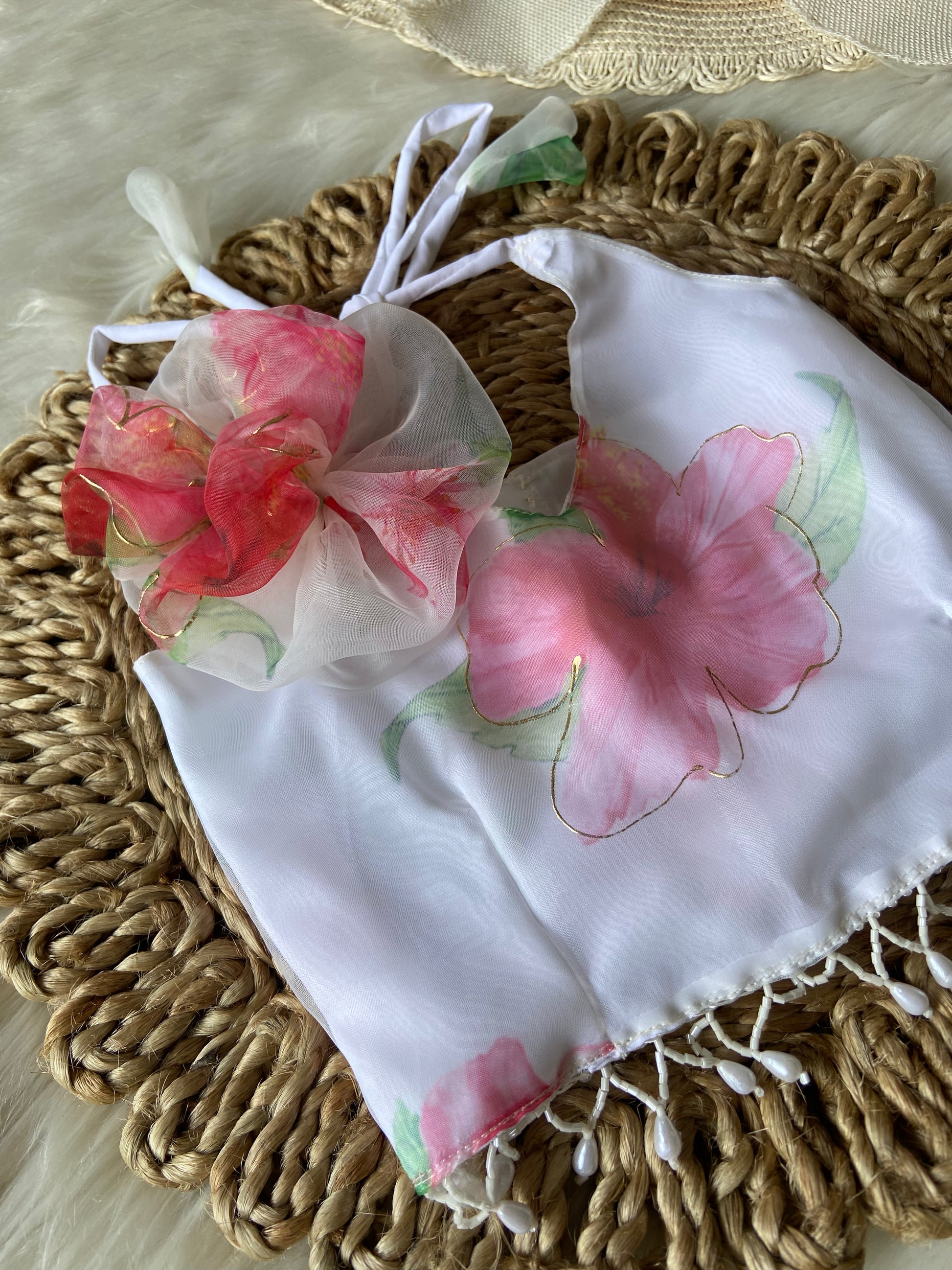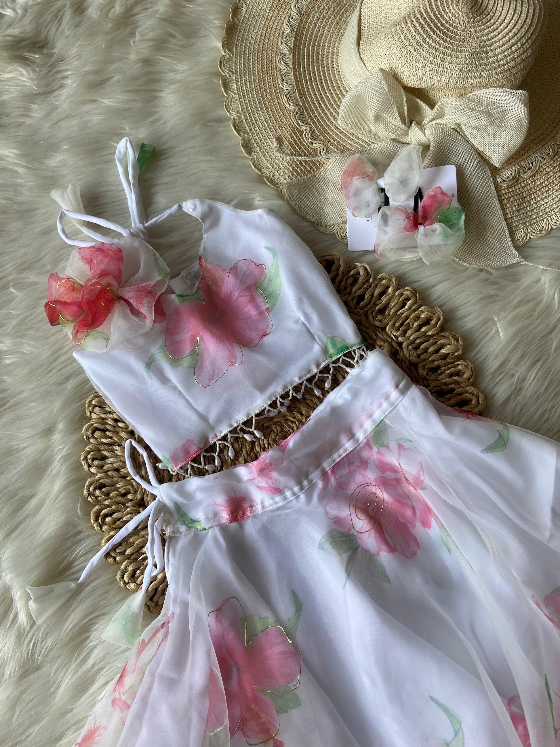 - Floral Organza Foil Print halter Neck Top with Flowy Organza Skirt