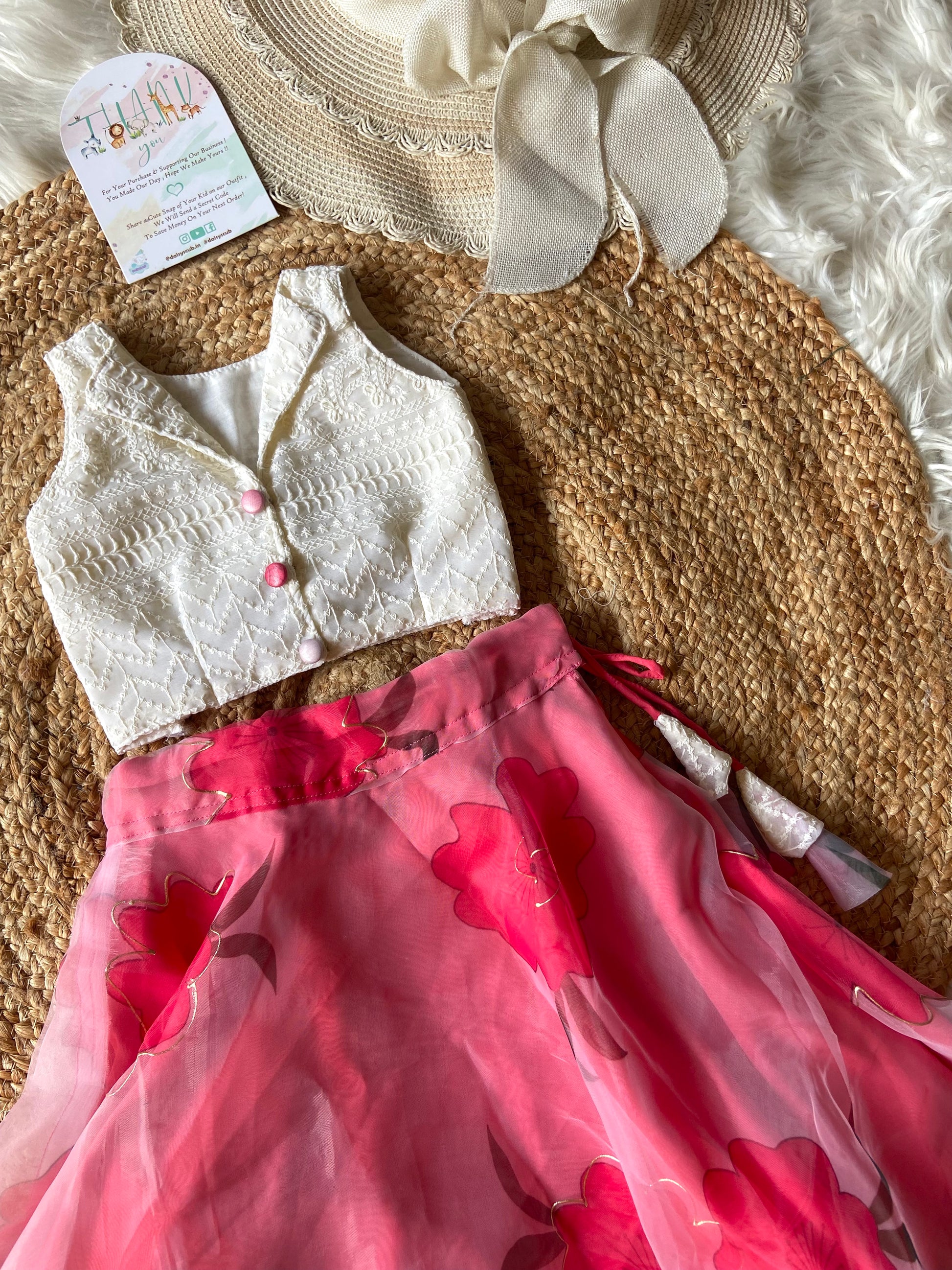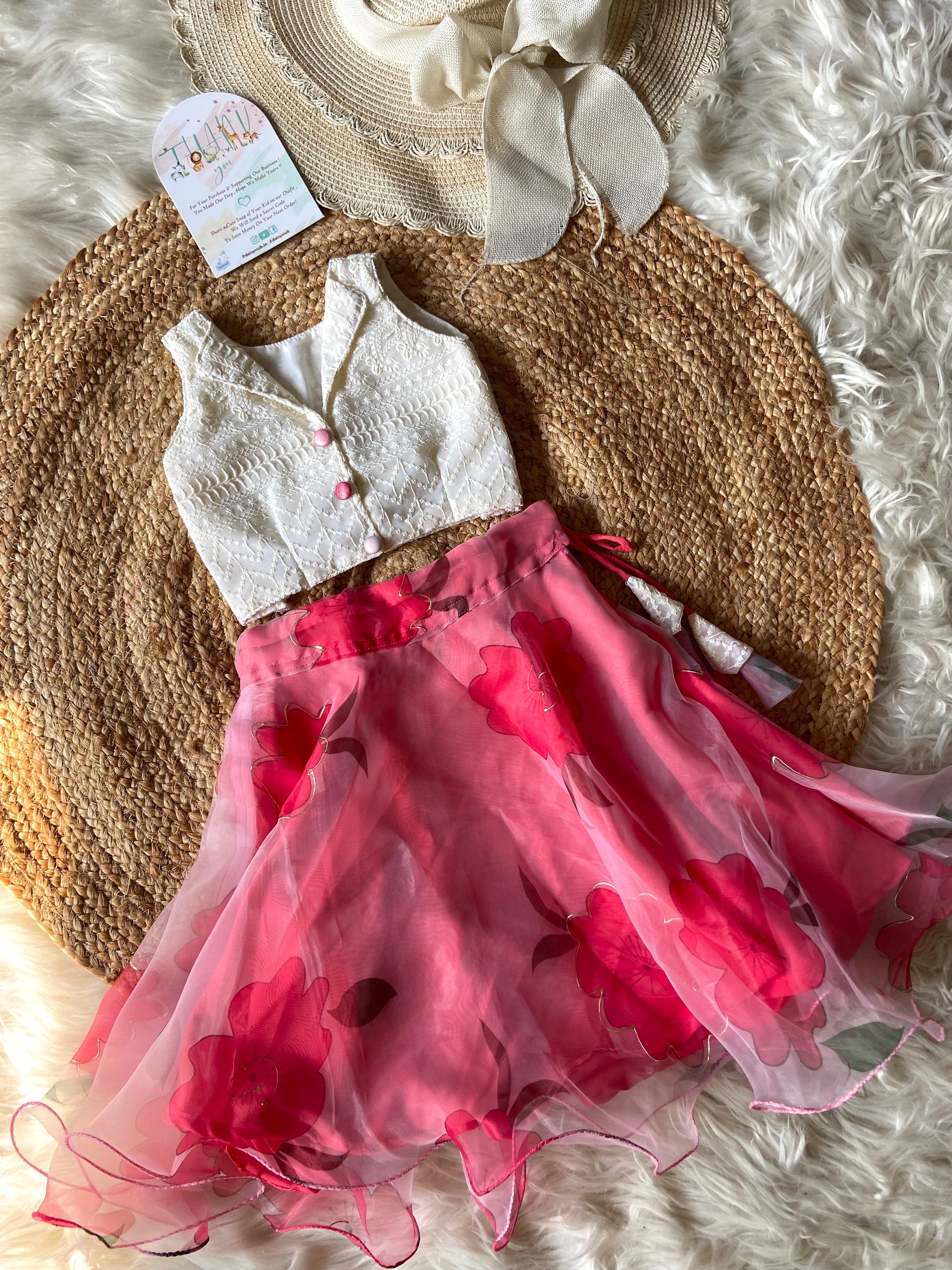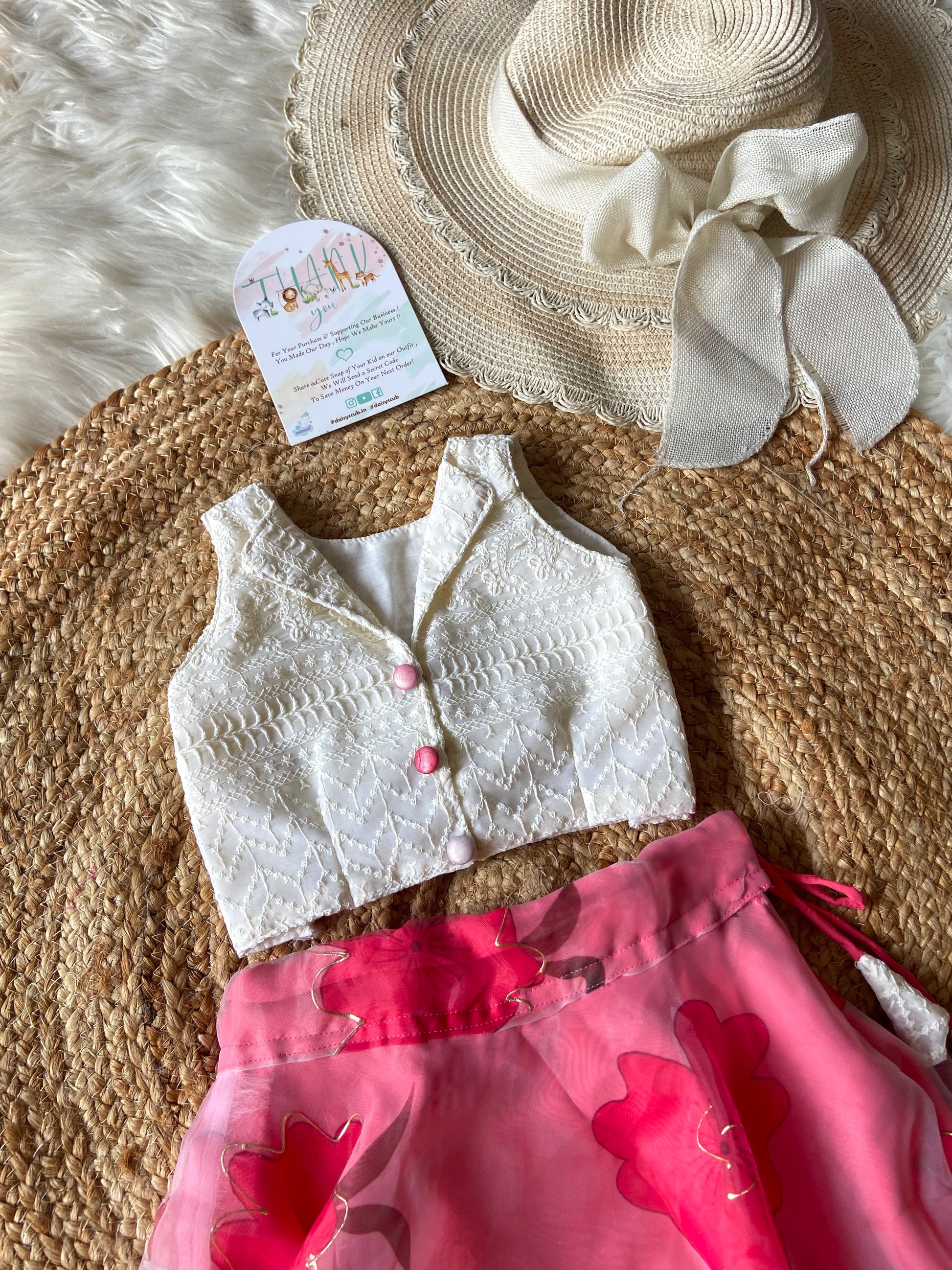 - Half white Lucknowi Top with designer buttons & Drawstring Flowy Skirt