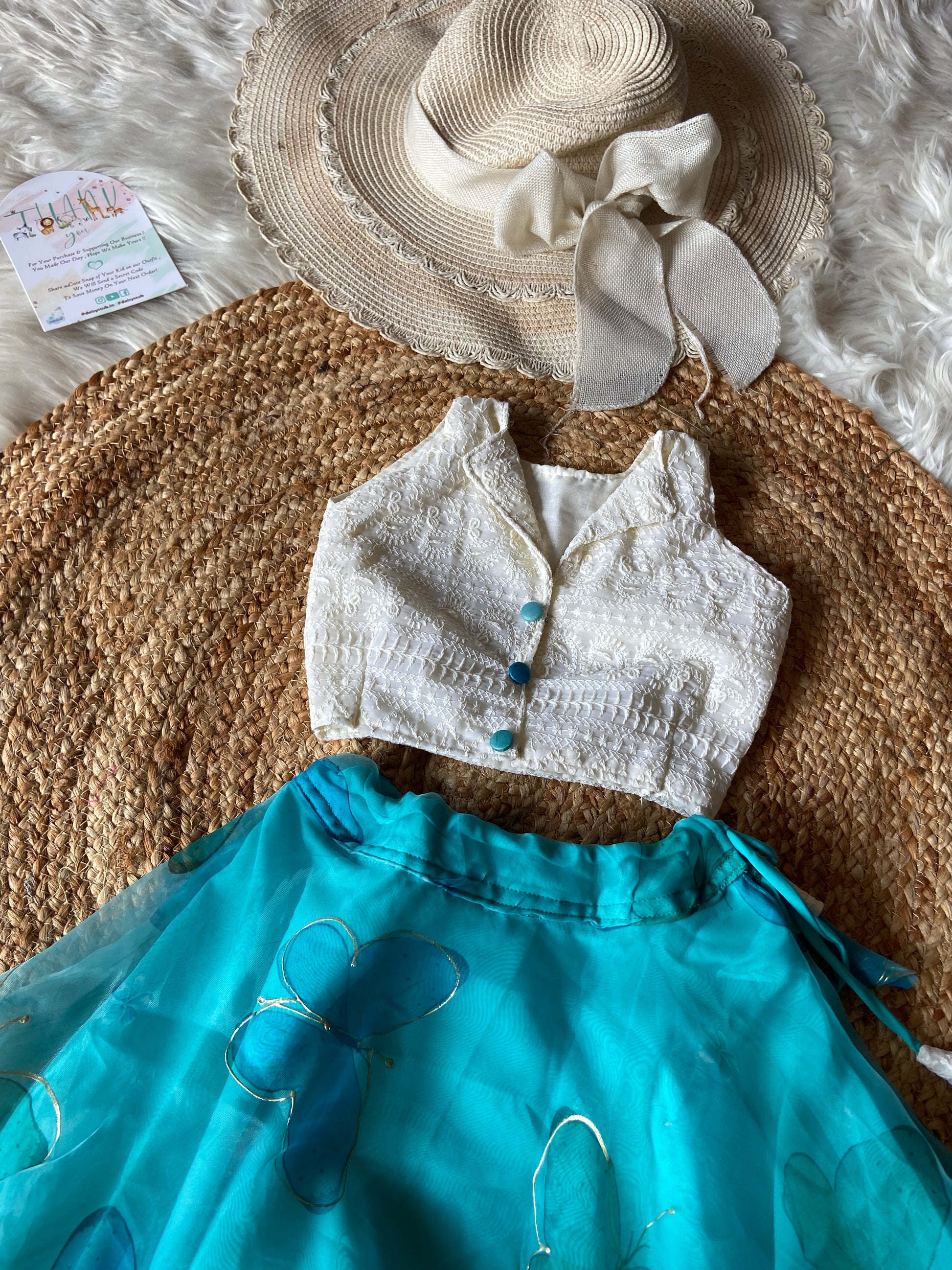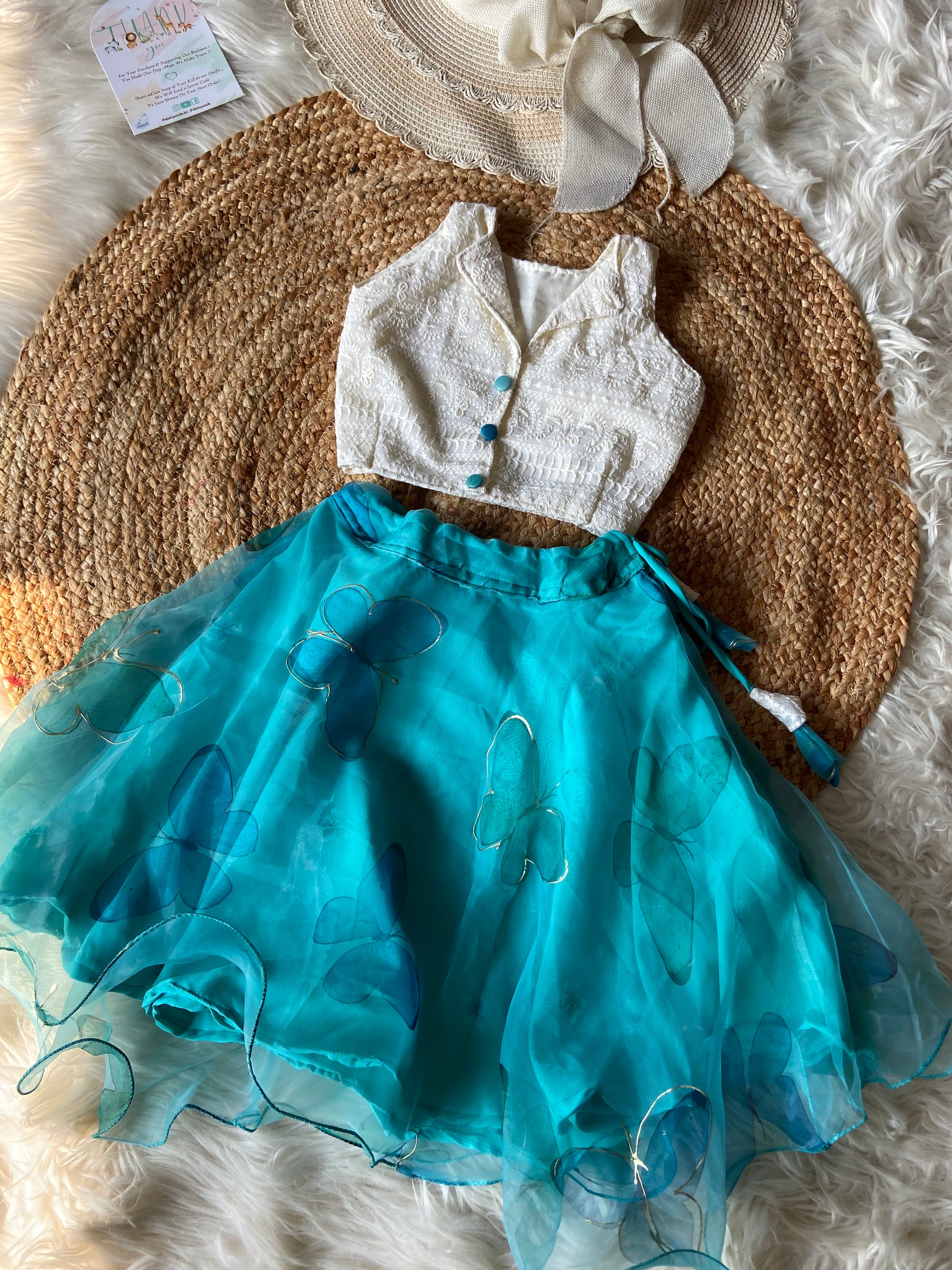 - Half white Lucknowi Top with designer buttons & Drawstring Flowy Skirt