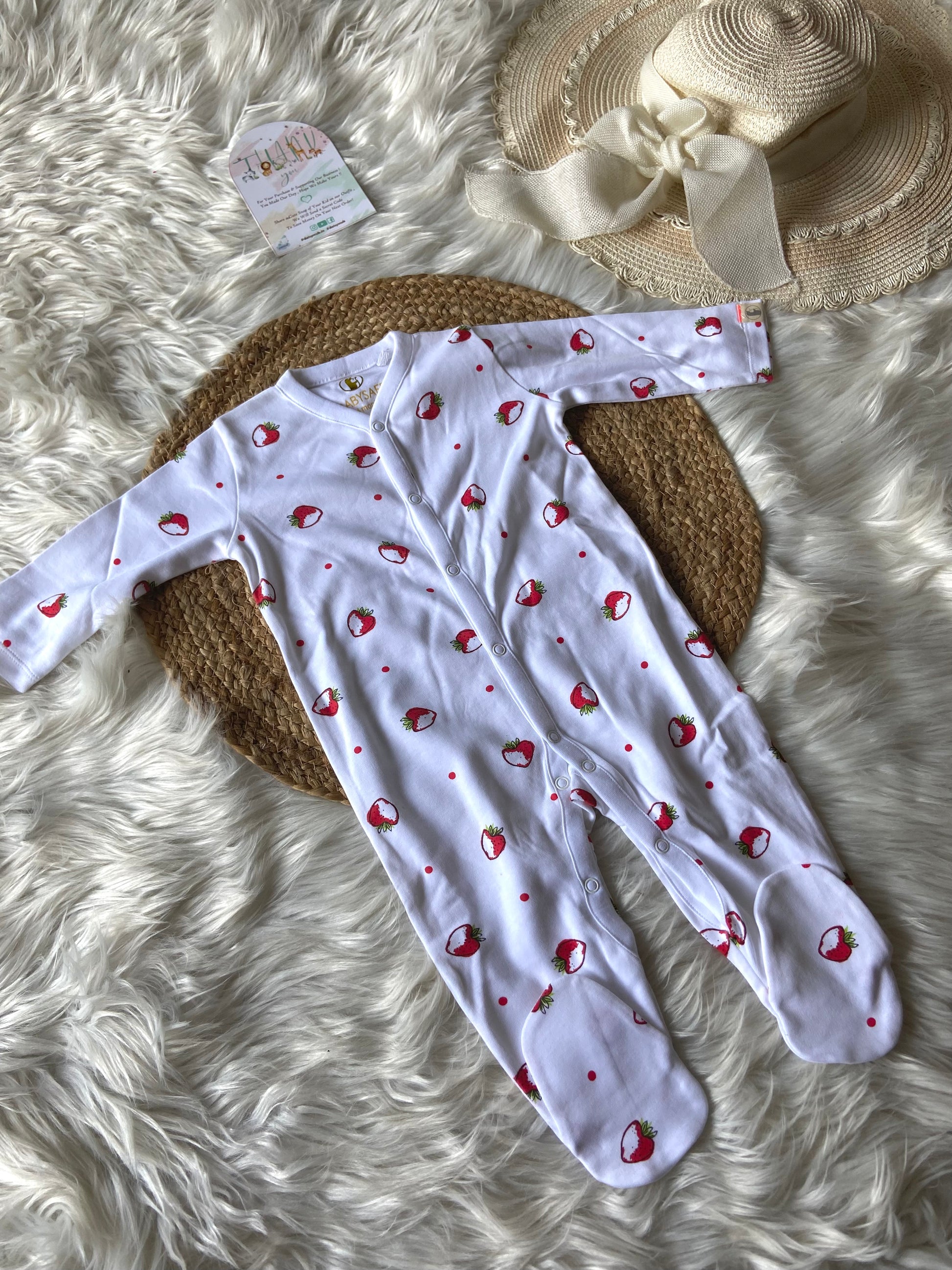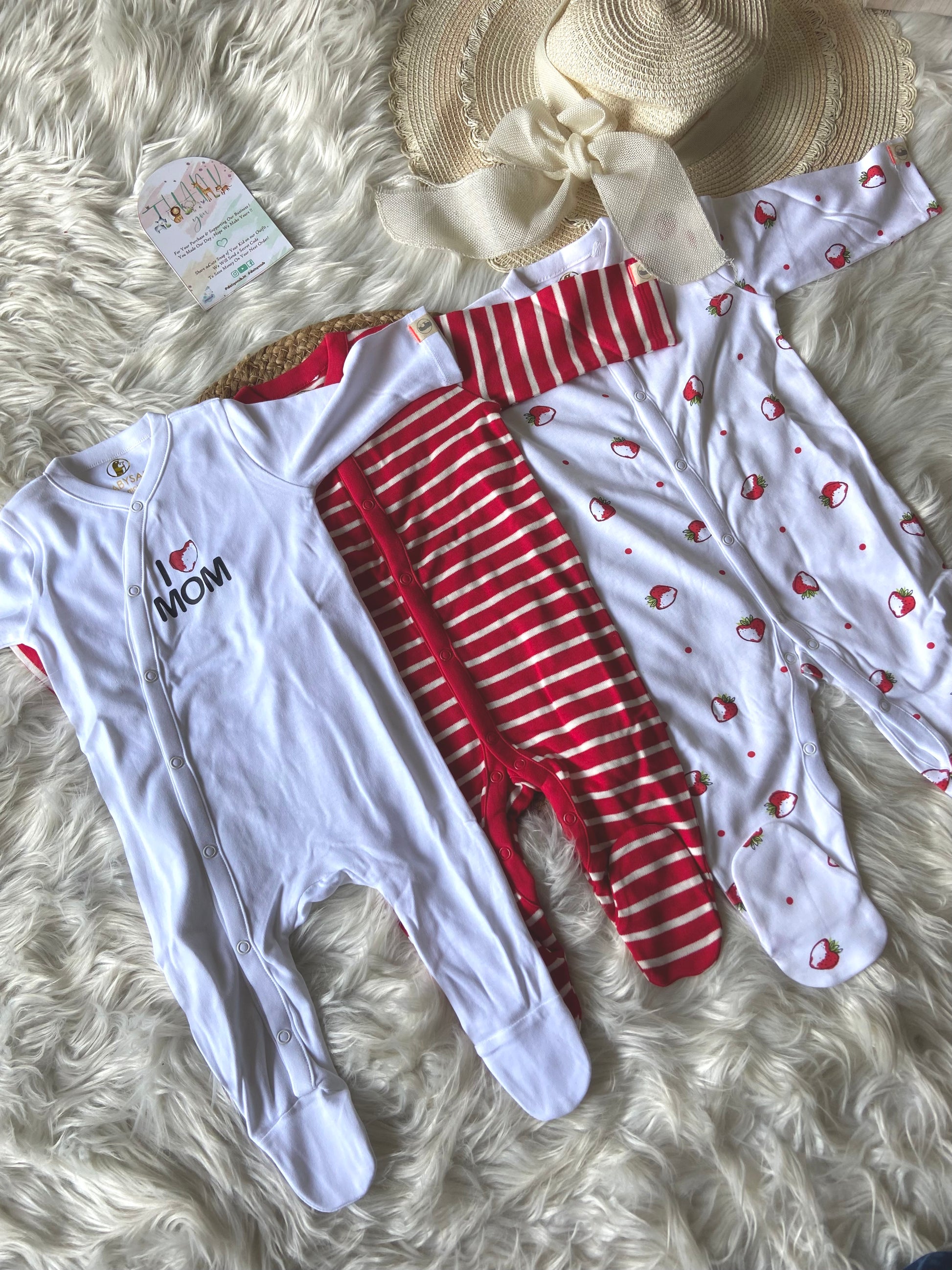 Super Soft Breathable Organic Cotton Sleepsuit with 3 Different Prints ( I love Mom , Red Horizontal Stripe & Strawberry Prints )