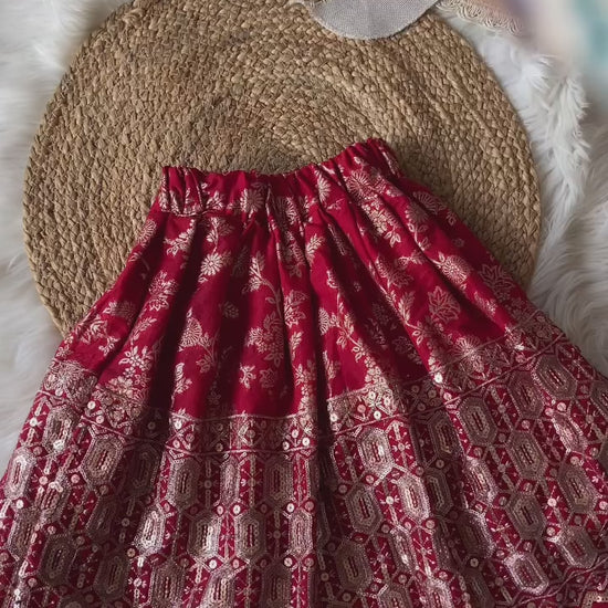 Red Banarasi Heavy Sequence Daman Border Skirt With Classic V cut Designer Blouse with Lace Detailing All Over.