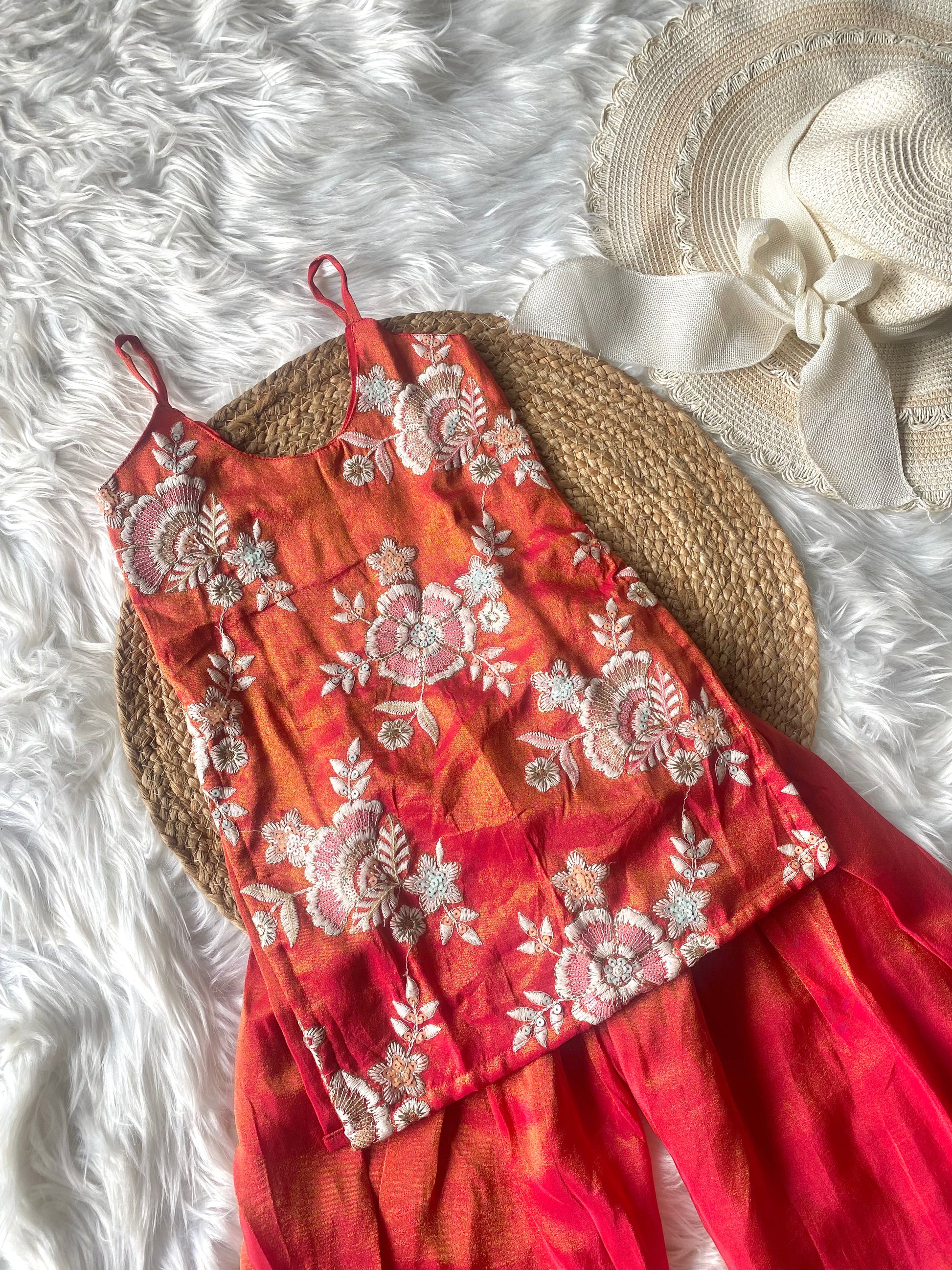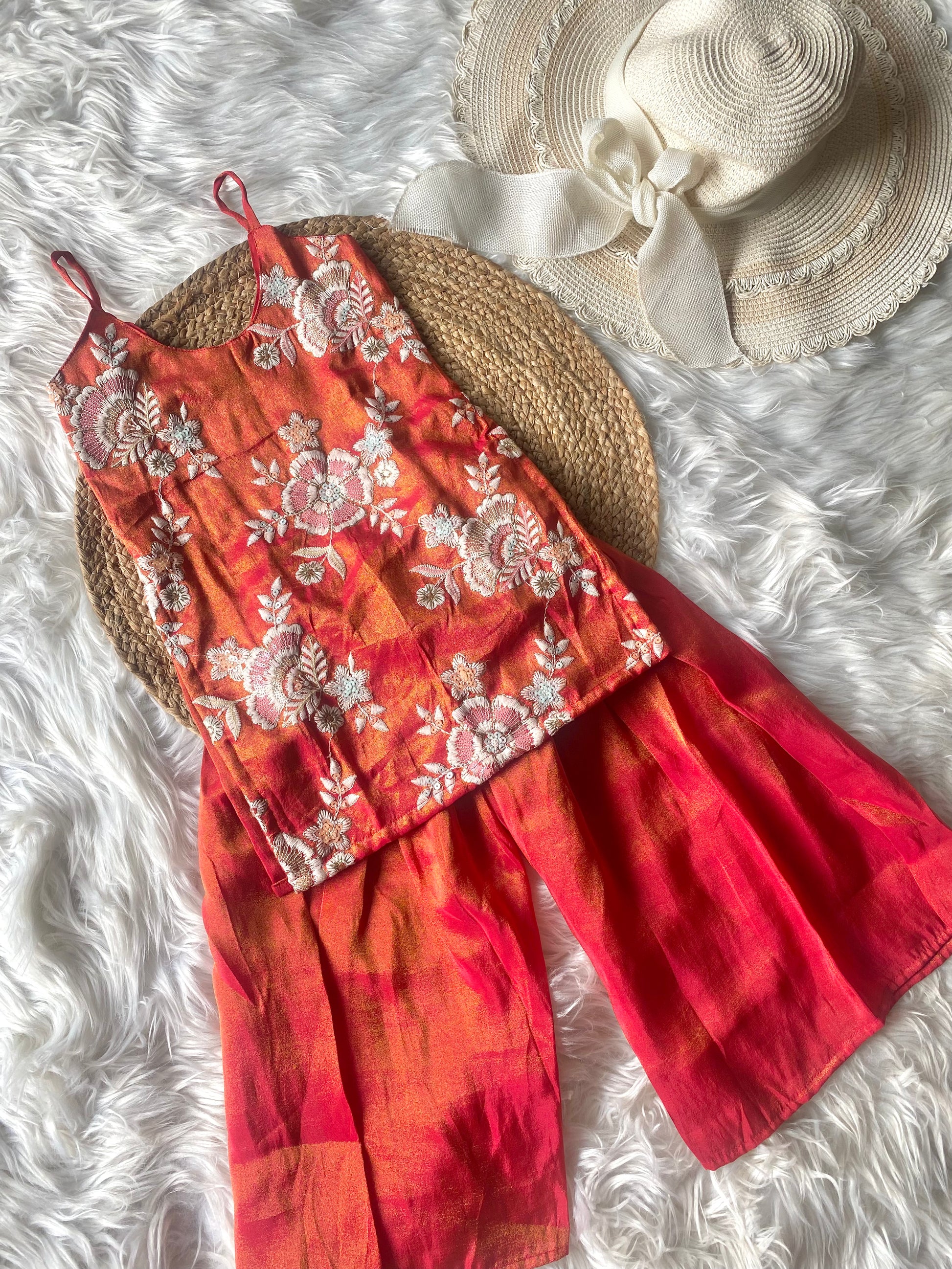 - Pure Zari Tissue Sequence Embroidery Pearl Detailing Kurta with Rust Orange Plain Zari Tissue Parallel Pants with Dupatta