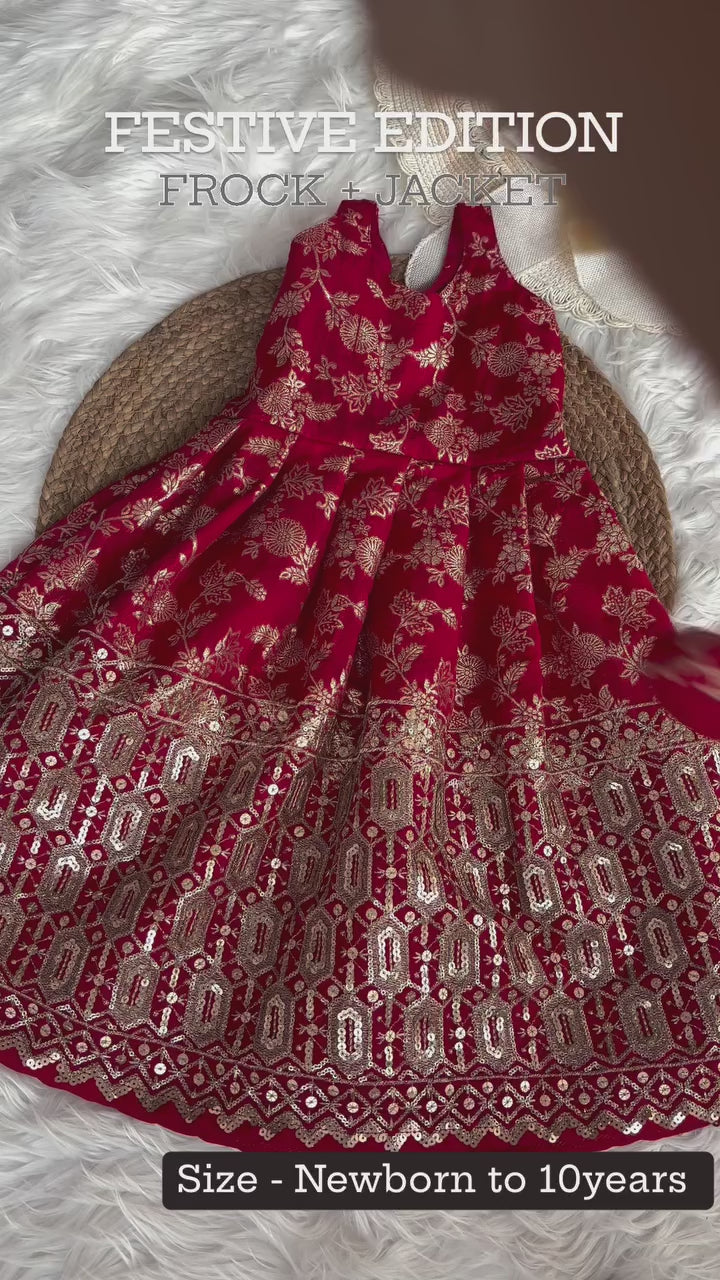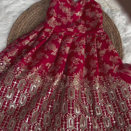 Red Banarasi Heavy Sequence Daman Border Gown With Contrast Striped Golden Zari Puff Sleeves Jacket